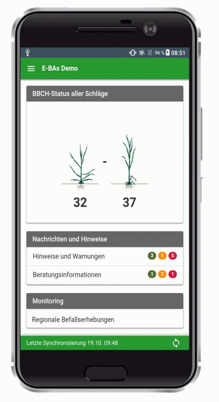 Ziel des Projektes E-BAs2 ist die Entwicklung einer Smartphone APP, welche mittels Eingaben wie Saatzeitpunkt, Bearbeitung und Bodenart sowie aktueller Wetterdaten Entscheidungshilfen für die bedeutendsten Krankheiten im Getreideanbau bereitstellt. Dabei liefert das Ontogenesemodell SIMONTO dem Anwender Informationen über das Entwicklungsstadium seiner Kultur und bildet damit auch den Grundstock für den terminlichen Aufruf weiterer Entscheidungshilfen zur Prognose von Schaderregern. Die Unterstützung reicht von der Prognose der tagaktuellen Infektionsrisiken bis zu Hinweisen und Warnungen sowie Beratungsinformationen und regionalen Befallserhebungen. Dies erhöht die Verfügbarkeit wichtiger Daten und erweitert die Möglichkeiten des Integrierten Pflanzenschutzes.