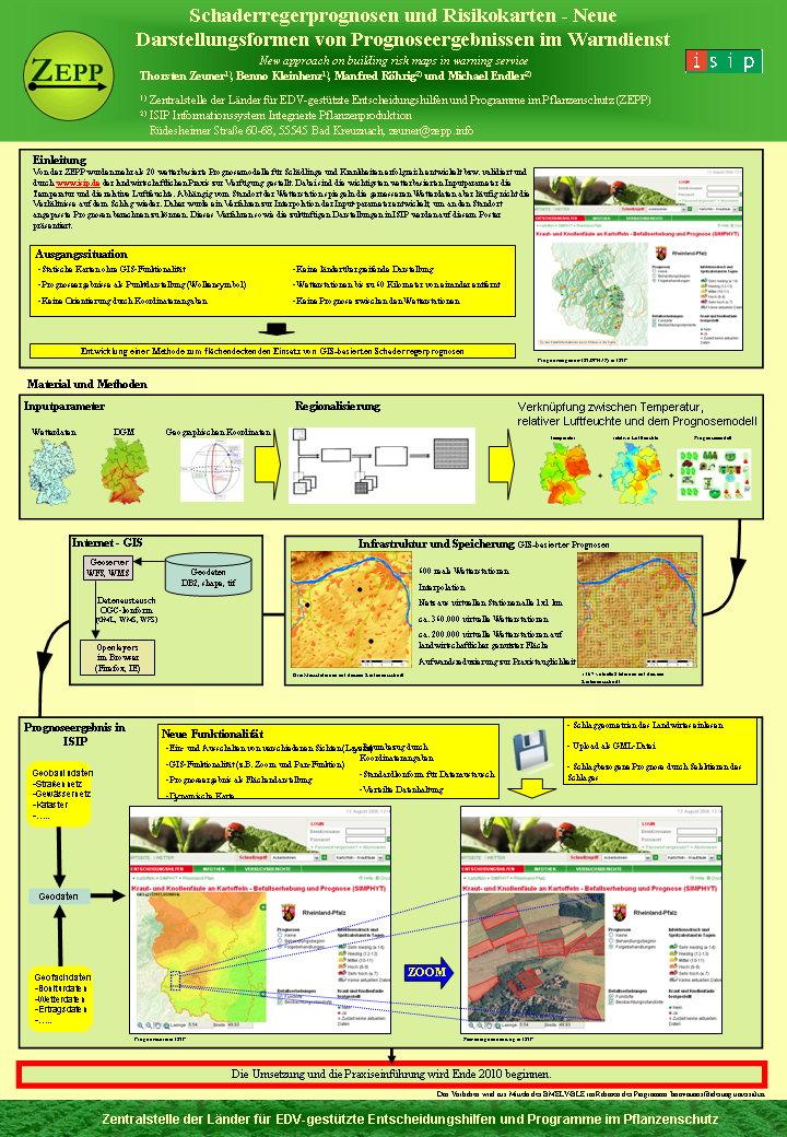 Repräsentative Ergebnisse für wetterbasierte Prognosemodelle waren in ISIP bisher nur für die direkte Umgebung der Wetterstationen möglich. Durch den Einsatz von GIS werden die Wetterdaten für die Prognosemodelle separat zusammengestellt und mit Hilfe von multiplen Regressionen interpoliert. Dieses Verfahren wurde im Rahmen des BMELV – Projektes „ Landwirtschaftliche Schaderregerprognose mit Hilfe von Geographischen Informationssystemen“ von 2005 bis 2008 bei der ZEPP entwickelt und ermöglicht die flächendeckende Berechnung der Lufttemperatur und relativen Luftfeuchte auf Basis der geographischen Lage sowie der Höhe über NN. Zusätzlich gehen regionale Anbauhäufigkeit, Vorjahresbefall, Fruchtfolge in die Berechnungen der Prognosemodelle ein. Die Ergebnisse werden unter www.isip.de präsentiert.