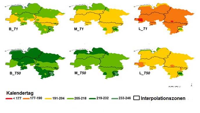 Abb. 1: Ergebnisse von CERCBET1 auf Basis der Projektionen des Klimamodells REMO dargestellt als Risikokarte mit regionaler Einteilung von Niedersachsen in Interpolationszonen. Abgebildet sind die Termine T1 (Erstauftreten) und T50 (Start Befallskontrolle) in den drei Zeitfenstern B (1971-2000), M (2021-2050) und L (2071-2100).
