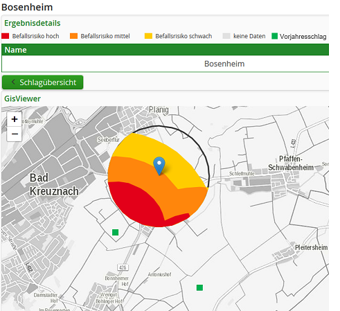 Die Erbsenwickler überwintern im Boden des Vorjahres-Erbsenschlages und werden im Frühjahr von den blühenden Erbsenpflanzen angelockt. Somit muss ein Flug zum Erbsenschlag stattfinden. Im 1. Modul des EHS wird die Prognose für das Befallsrisiko durch diesen Befallsflug auf einer “Risikokarte“ angezeigt. In diesem geographischen Modul geht es darum die Erbsenschläge so weit wie möglich von den Vorjahresschlägen entfernt anzubauen. Die Ergebnisse des Monitorings zeigten, dass der Befall exponentiell mit zunehmender Distanz zum Vorjahresschlag abnimmt. In dem Modul sind verschiedene Distanzdaten für Futter-bzw. Vermehrungs-und Gemüseerbsen hinterlegt. Da Gemüseerbsen schneller abblühen und bereits grün geerntet werden, bevor sich der Erbsenwickler vollständig entwickeln kann, sind die Befallszeit und der Befallsdruck in diesen Regionen geringer. Dadurch ist meist eine geringere Distanz zu den Vorjahresschlägen ausreichend, um Starkbefall zu vermeiden. Beim Anbau von Futtererbsen muss dieser Abstand größer sein, da die Erbsen komplett ausreifen und somit der Entwicklungszyklus des Erbsenwicklers vollständig durchlaufen wird und dadurch der Befallsdruck größer sein kann. Um diese Anbauplanung zu erleichtern, steht unter www.isip.de (ISIP) zukünftig ein Service zur Verfügung, der das Befallsrisiko in Abhängigkeit der Distanz und Kulturform berechnet. Der Anwender trägt dazu sowohl die Position der bekannten Vorjahresschläge in der Umgebung, als auch die aktuelle Schlagposition in einer Karte ein. Das Planungstool berechnet anschließend einen Risikofaktor basierend auf dem Abstand zu den Vorjahresschlägen (Abbildung 1). Somit können Schäden präventiv verringert oder im besten Fall vermieden werden. In einer weiteren Ausbaustufe für die nächsten Jahre ist geplant die Lage der Erbsenschläge durch satellitenbasierte Fernerkundung automatisiert bereitzustellen.