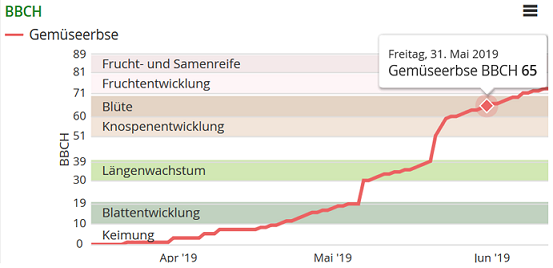 Erbsenwickler-Falter fliegen bevorzugt blühende Erbsenbestände zur Eiablage an. Der Samenfraß durch die Erbsenwicklerlarven kann erst ab der Hülsenbildung einsetzen. Somit sind die Blüte und die Hülsenbildung die entscheidenden Entwicklungsstadien für den Befall. In Modul 2 „SIMONTO-Erbse“ erfolgt die Simulation der Entwicklung der Erbse (Abbildung 2), um die befallsgefährdeten Entwicklungsstadien zu prognostizieren. Für die Modellentwicklung wurde auf den Schlägen in den Untersuchungsregionen die Entwicklung auf Basis der BBCH-Skala über die gesamte Vegetationsperiode aufgenommen. Es wurden Modelle für Futter- und für Gemüseerbsen entwickelt. Bei der Entwicklung der Erbsenpflanzen spielen die Temperatur und die Photoperiode die entscheidende Rolle. Die SIMONTO-Erbsenmodelle wurden mit unabhängigen Datensätzen überprüft. Die Trefferquote für die korrekte Vorhersage der BBCH-Stadien liegt im Schnitt bei bis zu 82 %. Die Berechnung kann schlagspezifisch ab dem Aussaatdatum durchgeführt werden, wenn die geographischen Koordinaten, das Aussaatdatum und die Kulturform angegeben werden. Das Berechnungsergebnis wird in ISIP graphisch als BBCH-Stadien-Verlauf in Abhängigkeit des Datums dargestellt (Abbildung 2).