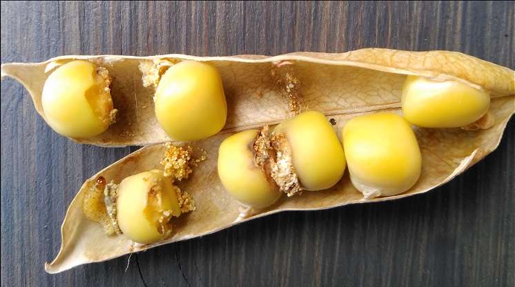 Sobald die Erbsenwickler am Erbsenschlag angekommen sind, legen die Weibchen ihre Eier an den Pflanzen ab. Nach dem Schlupf bohren sich die Larven in die Hülsen ein. Innerhalb der Hülse entwickeln sie sich bis zum fünften Larvenstadium. Sie ernähren sich von den heranwachsenden Erbsensamen und verursachen somit die typischen Fraßschäden (Abbildung 4). Danach bohren sie sich aus den Hülsen aus und vergraben sich im Boden zur Überwinterung. Da die jungen Larven nach dem Eischlupf nur kurze Zeit außerhalb der Hülsen sind, ist es schwierig den richtigen Zeitpunkt für eine Insektizidbehandlung zu bestimmen. Eine Hilfestellung leistet das Modul 3 „Populationsdynamik Erbsenwickler“. Für dieses Modul wurden auf den Erbsenschlägen in den Modellregionen die Flugaktivität und das Auftreten der einzelnen Larvenstadien bonitiert. Zusätzlich wurden im Klimaschrank die temperaturabhängige Falter- und Eientwicklung untersucht. Dadurch kann auf der Basis von einem wetterbasierten Modell die Wahrscheinlichkeit abgebildet werden, ab wann der Befallsflug stattfindet. Das kann durch Pheromonfallen zusätzlich präzisiert werden. Die Eiablage und der Schlupfzeitpunkt der Larven werden ebenfalls anhand des Temperatursummenverlaufes berechnet, um die Notwendigkeit von Insektizidbehandlungen abzuschätzen sowie die Terminierung zu optimieren, um hohe Wirkungsgrade zu erreichen. Zusätzlich wird durch die Verknüpfung von Modul 3 und Modul 2 die Plausibilität abgefragt, ob ein Befall zeitlich überhaupt schon stattfinden kann. Diese Wahrscheinlichkeiten werden im ISIP-Output für jeden angelegten Schlag farblich gekennzeichnet (Abbildung 5).
