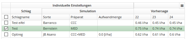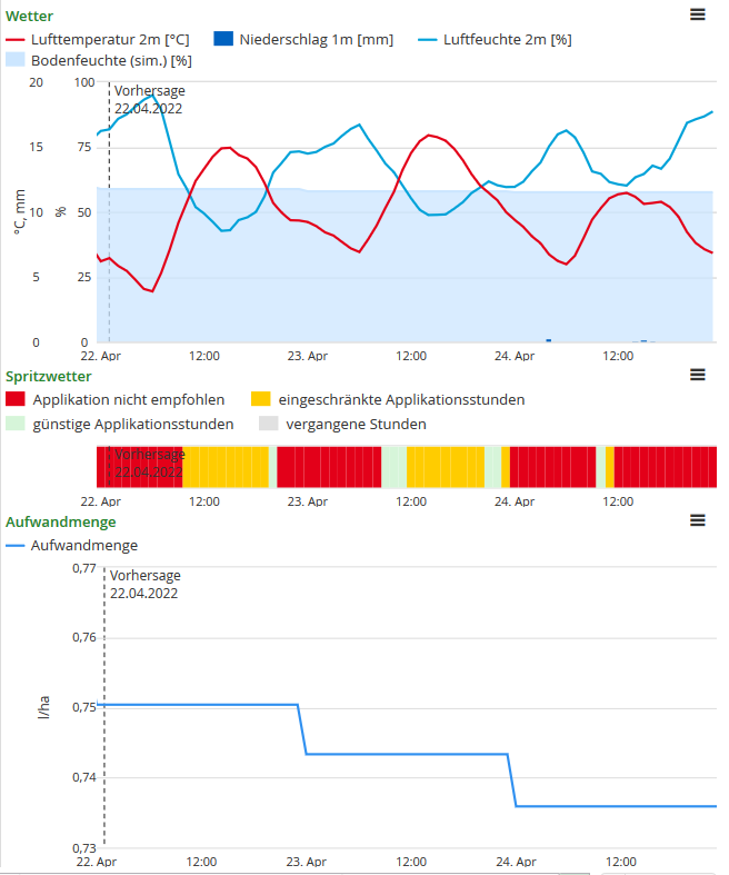 Seit der Saison 2022 steht das Entscheidungshilfesystem OPTIREG auf www.isip.de im internen Bereich den Beratern der Pflanzenschutzdienste zur Verfügung. Der Output der Entscheidungshilfe „OPTIREG“ zeigt zunächst die standardmäßige Abbildung des Wetters sowie die dazugehörige Abbildung des Applikationswetters, in der angeben wird, wie sich die stündlichen Applikationsbedingungen voraussichtlich darstellen werden. Das Applikationwetter richtet sich dabei jeweils nach den Anwendungsbestimmungen des einzusetzenden Mittels. So herrschen in grünen Bereichen günstige Applikationsbedingungen, in den orangenen Bereichen eingeschränkte Applikationsbedingungen und in den roten Bereichen wird von einer Behandlung abgeraten. Danach folgt eine Grafik sowie eine zusätzliche Tabelle mit den empfohlenen Aufwandmengen für die Applikationstage heute, morgen und übermorgen.