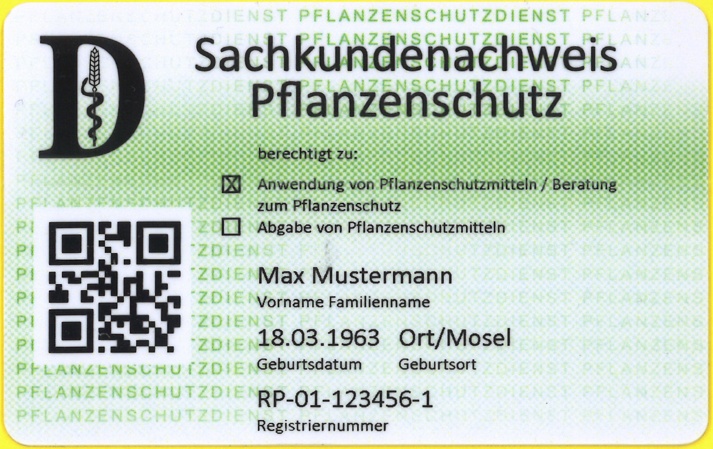 Auf dem neuen Sachkundenachweis sind folgende Daten aufgedruckt: Vor- und Nachname, Geburtsdatum, Geburtsort, Umfang der Sachkunde (Anwendung oder Verkauf oder beides), Beginn des ersten Fortbildungszeitraumes, Registriernummer, Ausstellungsort, Ausstellungsdatum und Unterschriftsfeld.